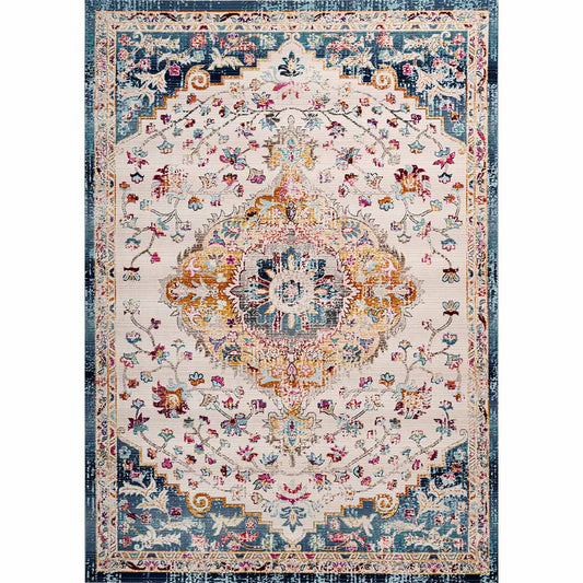 Orientteppich Bunt Vintage – Medaillon Teppich mit floralen Mustern in Blau Gelb Pink