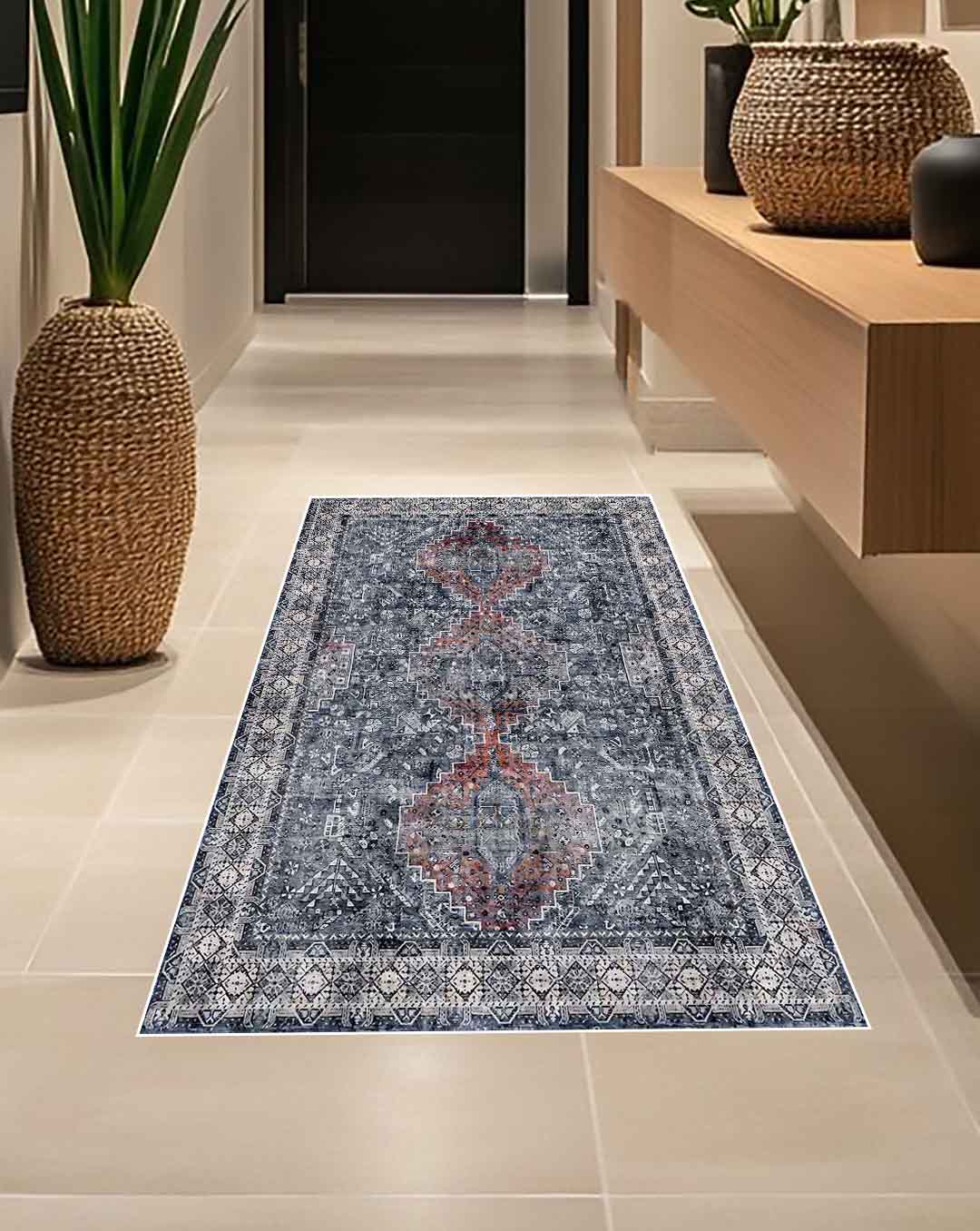 Mai is a vintage persian new style carpet has dark carpet background and mixture of classic curves in the most trending and modern colours mixtures that can unfortunately change area mode and style ,it's the best choice for livingroom carpet , bedroom runners and bedroom carpet and door mat. Easy cleaning make it beats all other carpets as it's washable carpet , Enjoy softness touch with the best colours and anti-slip back would make it the best choice ever for high and medium-traffic zones, kid and pet-friendly carpet and homes.