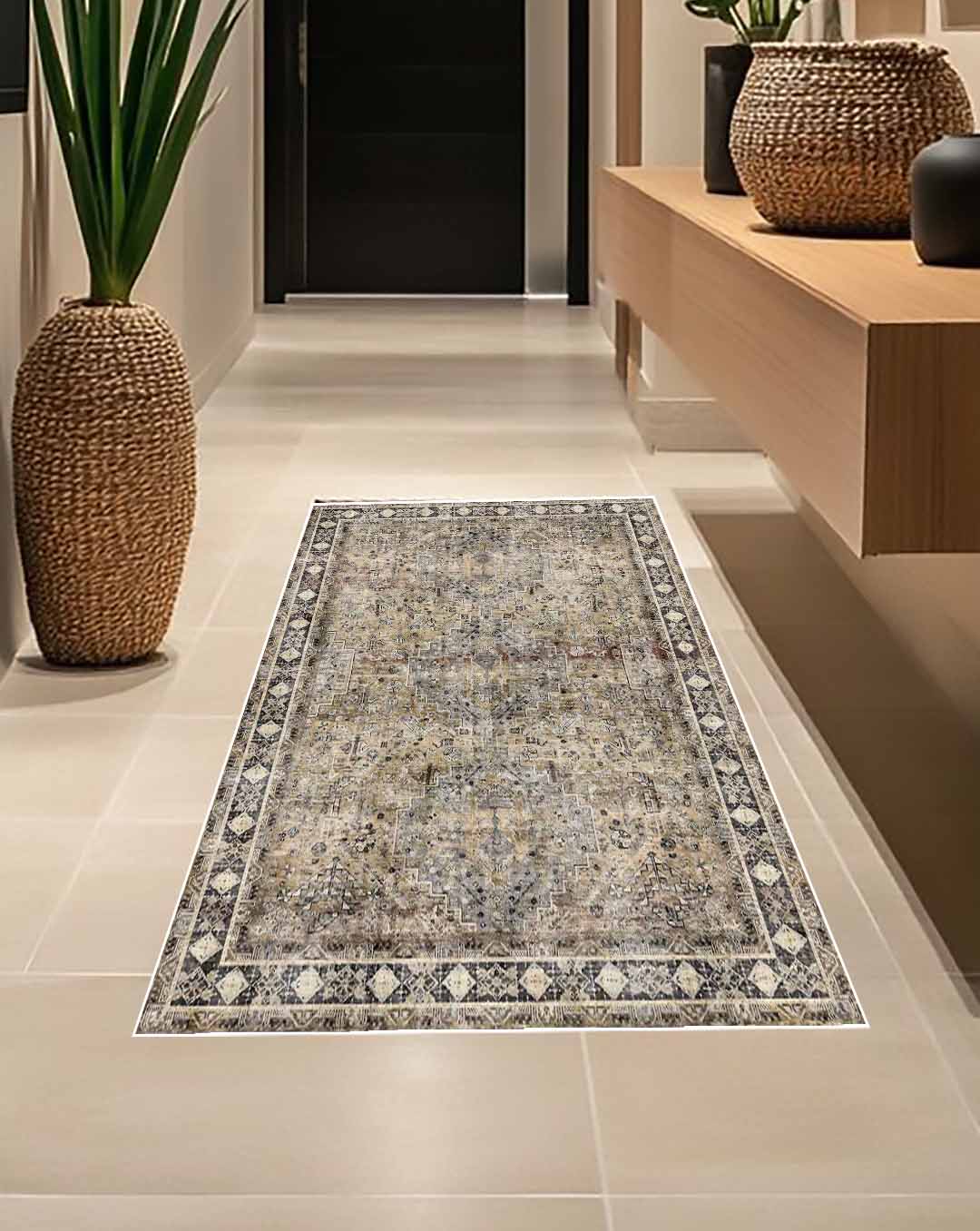 Karmel is a vintage persian new style carpet has light Beige carpet background and mixture of classic curves in the most trending and modern colours mixtures that can unfortunately change area mode and style ,it's the best choice for livingroom carpet , bedroom runners and bedroom carpet and door mat. Easy cleaning make it beats all other carpets as it's washable carpet ,  Enjoy softness touch with the best colours and anti-slip back would make it the best choice ever for high and  medium-traffic zones, kid and pet-friendly carpet and homes.